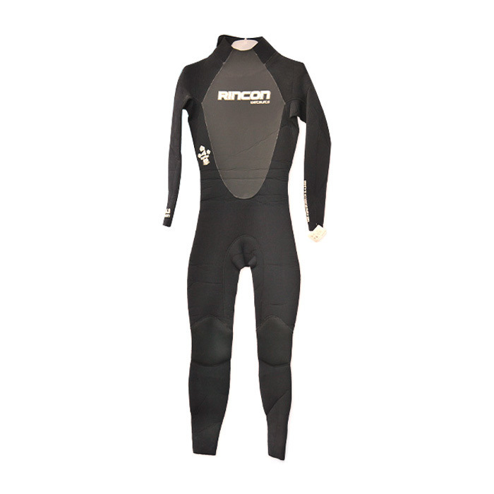 - The photo shows a full‑length black wetsuit with chest panel branding, long sleeves, and pre‑formed lower legs—consistent with a 3/2 to 4/3 mm GBS construction aimed at surfing and general watersports.
